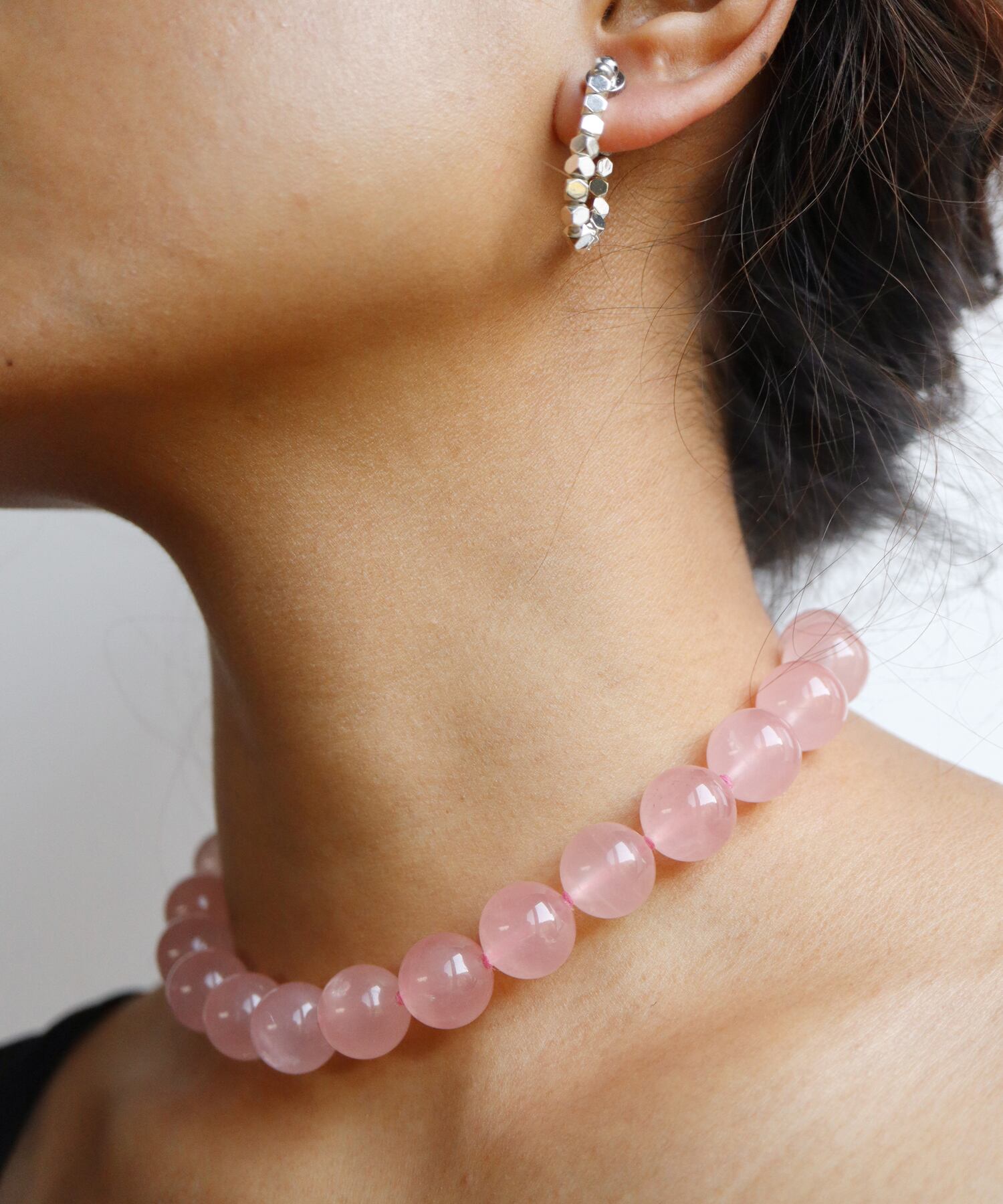シルバージュエリーと合わせれば、大人っぽく上品な印象に。ローズクォーツの美しいピンクが、身につける人の内側から輝きを引き出してくれます。