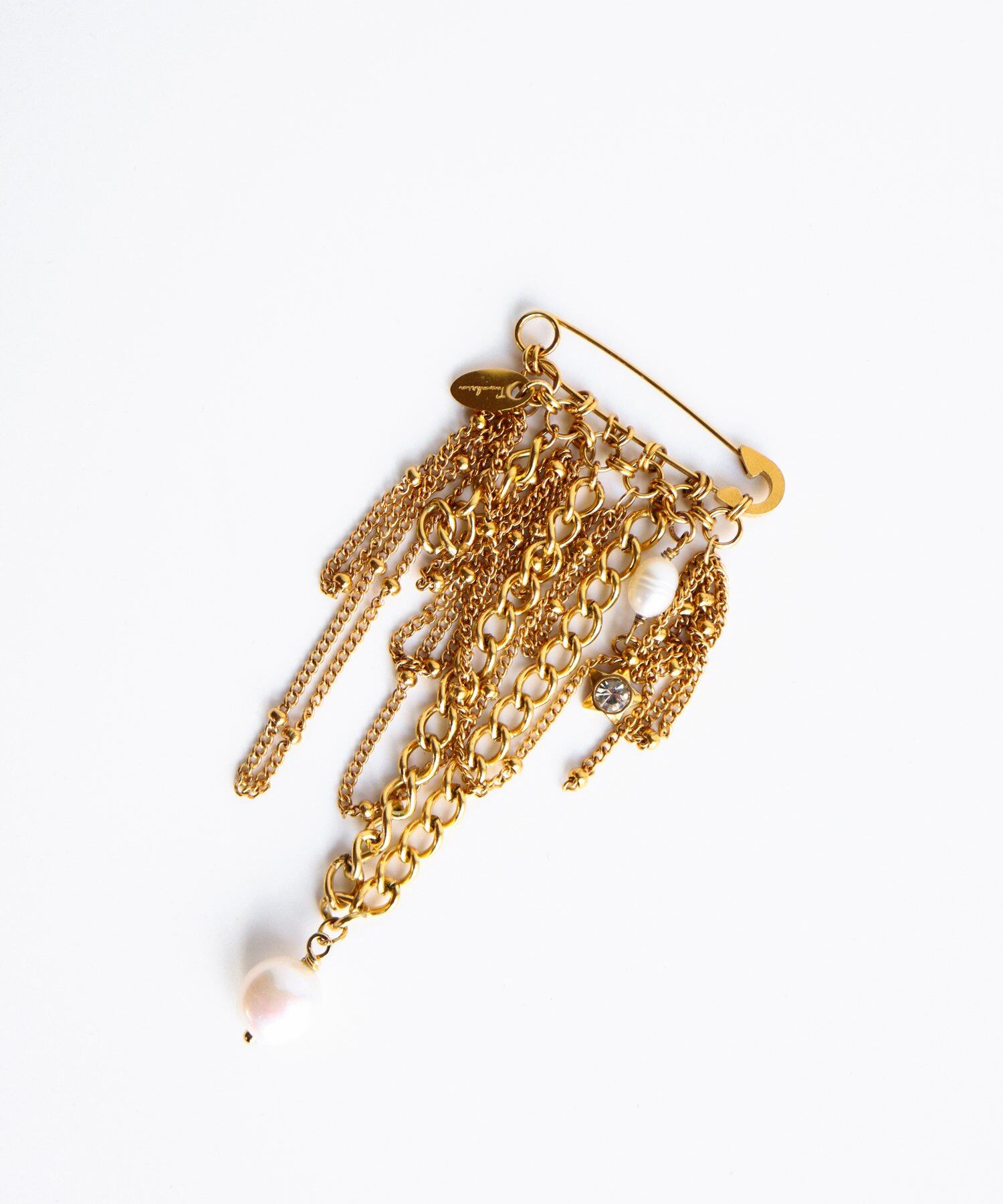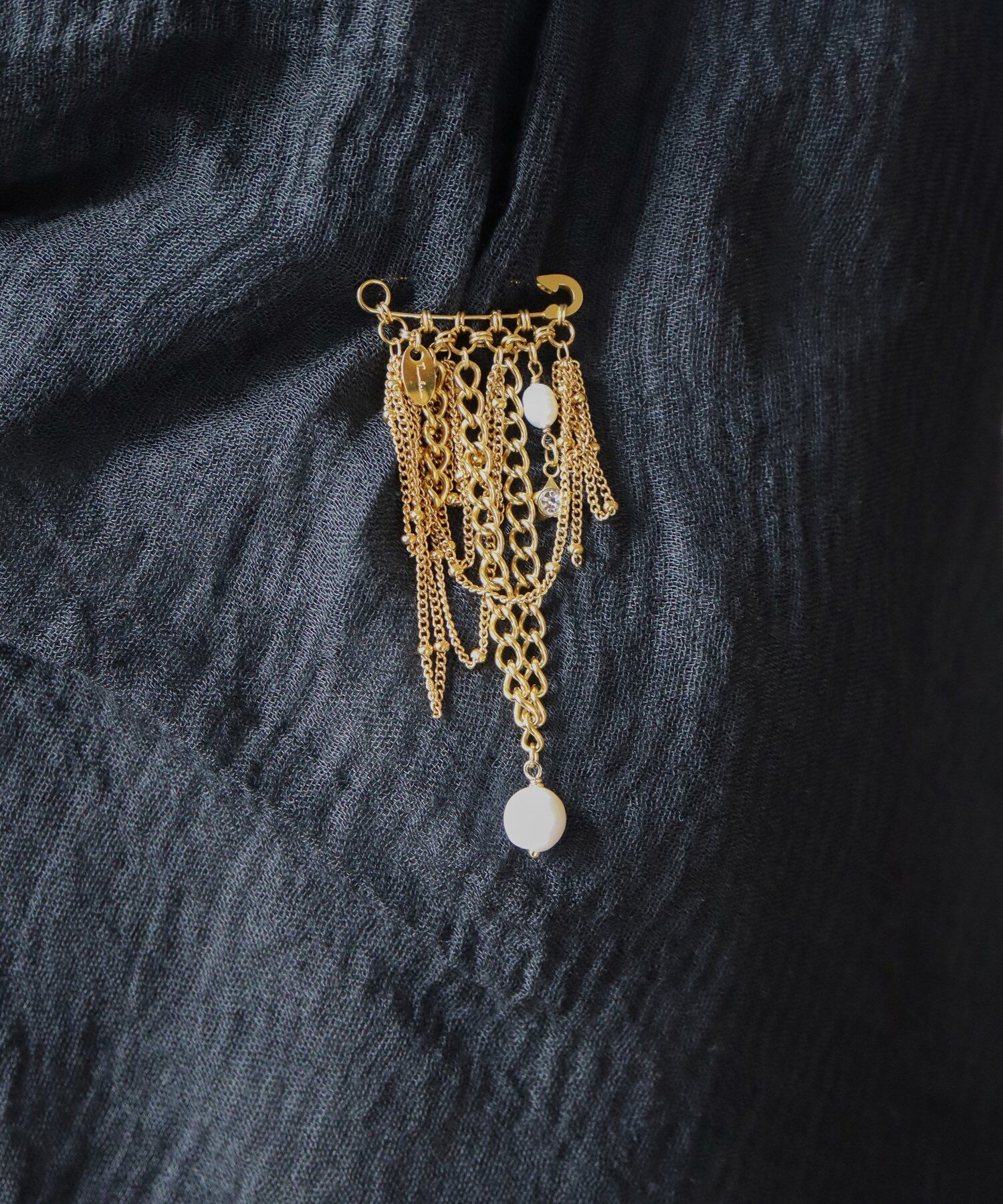 パールの上品な輝きに、ゴールドチェーンの軽やかな動きがアクセント。シンプルな装いにそっと華を添えてくれるブローチです。