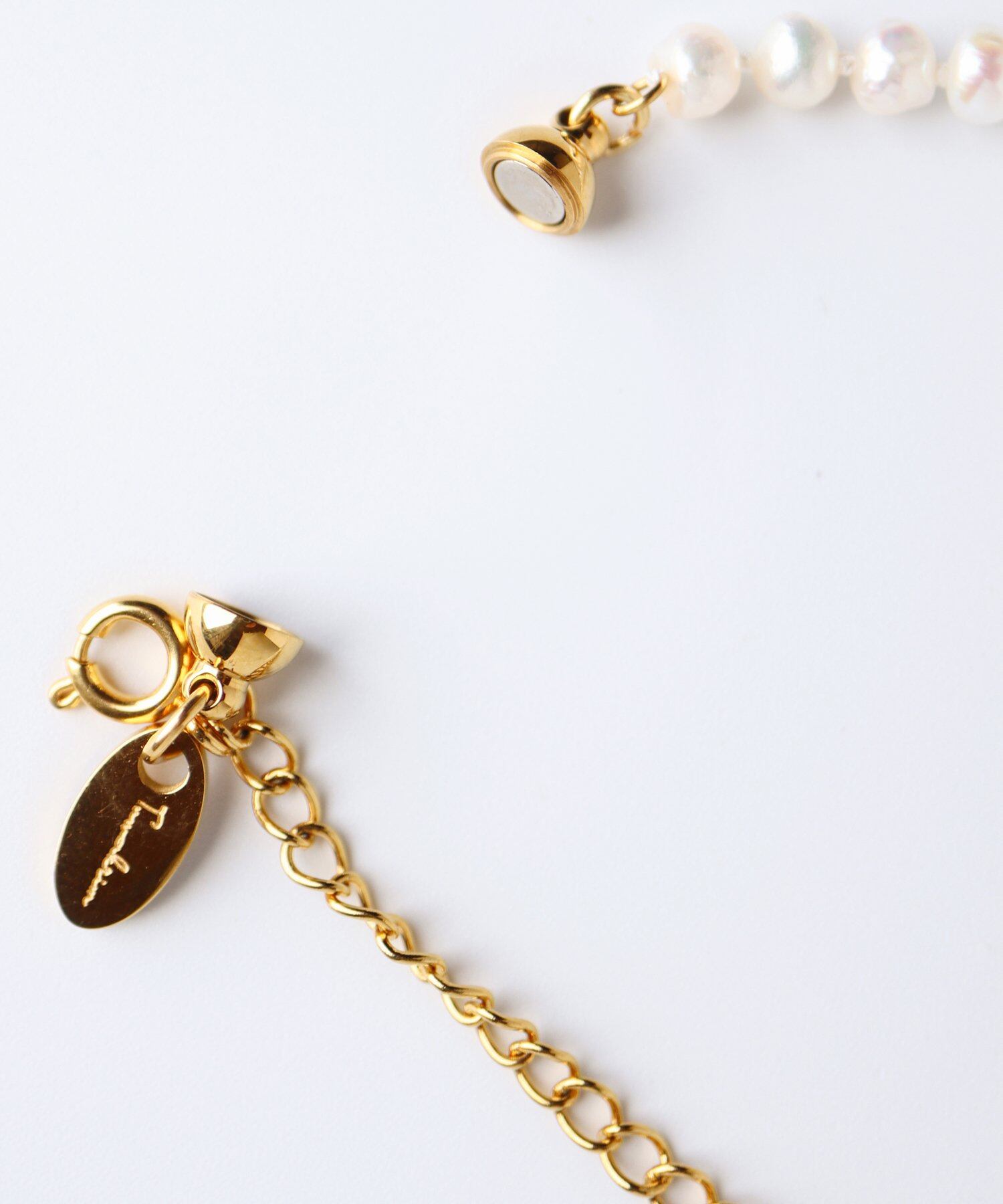 1. ネックレスの両端に付いているマグネットパーツを近づけると、カチッと簡単に装着できます。