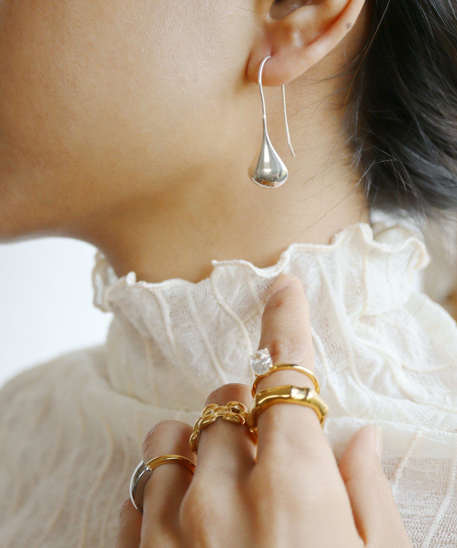 滴り落ちる水滴を思わせるドロップモチーフ。その形は「純粋さ」や「希望」を象徴し、耳元に洗練された輝きを添えます。滑らかな曲線とS925シルバーの純白の光沢が織りなすデザインは、どんなスタイルにも自然と馴染む万能感。