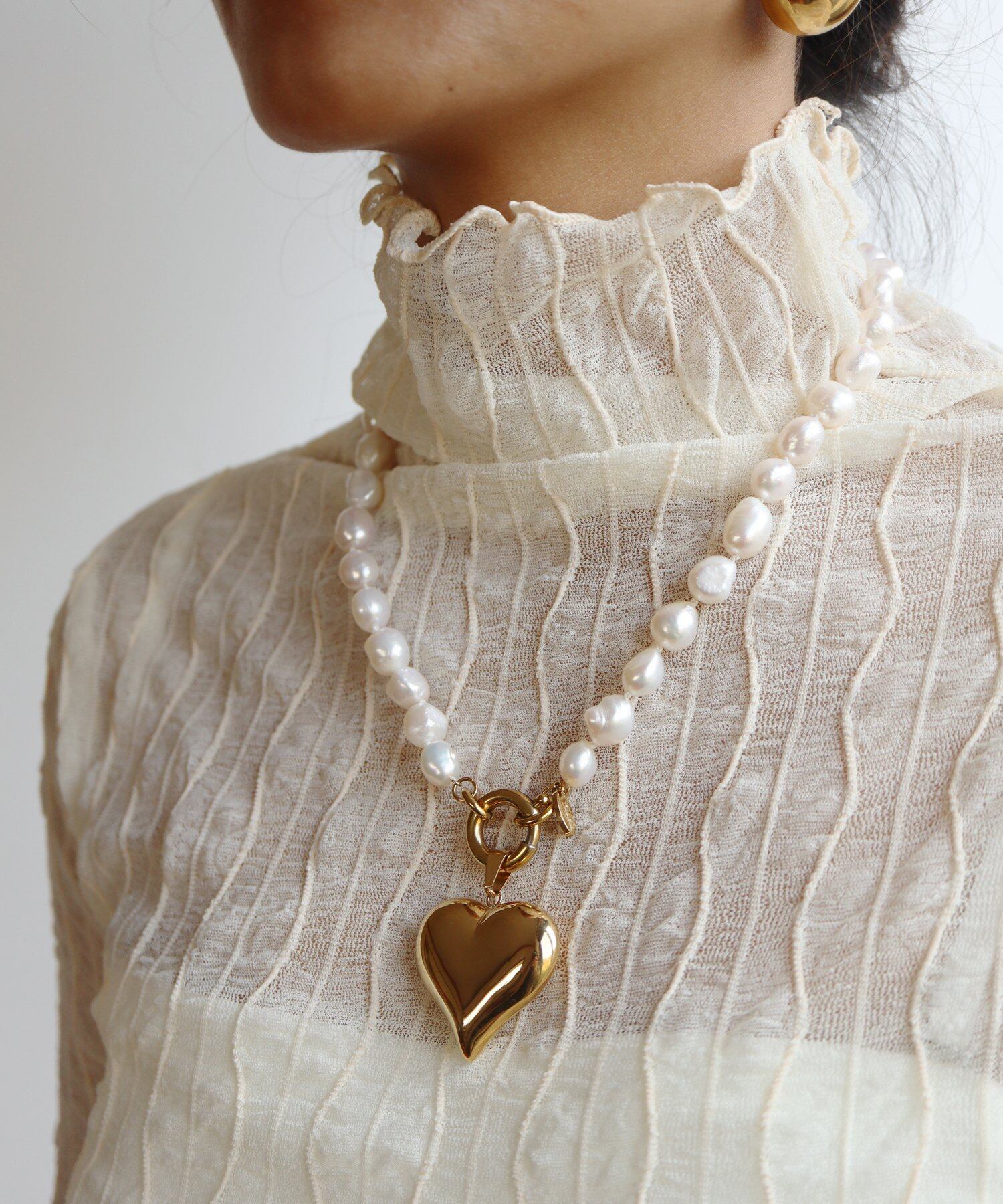 大ぶりのパールが首元を華やかに彩り、ハートチャームがとびきりキュートなアクセント。可愛いと可愛いを掛け合わせた、まさに最強の組み合わせです♡
