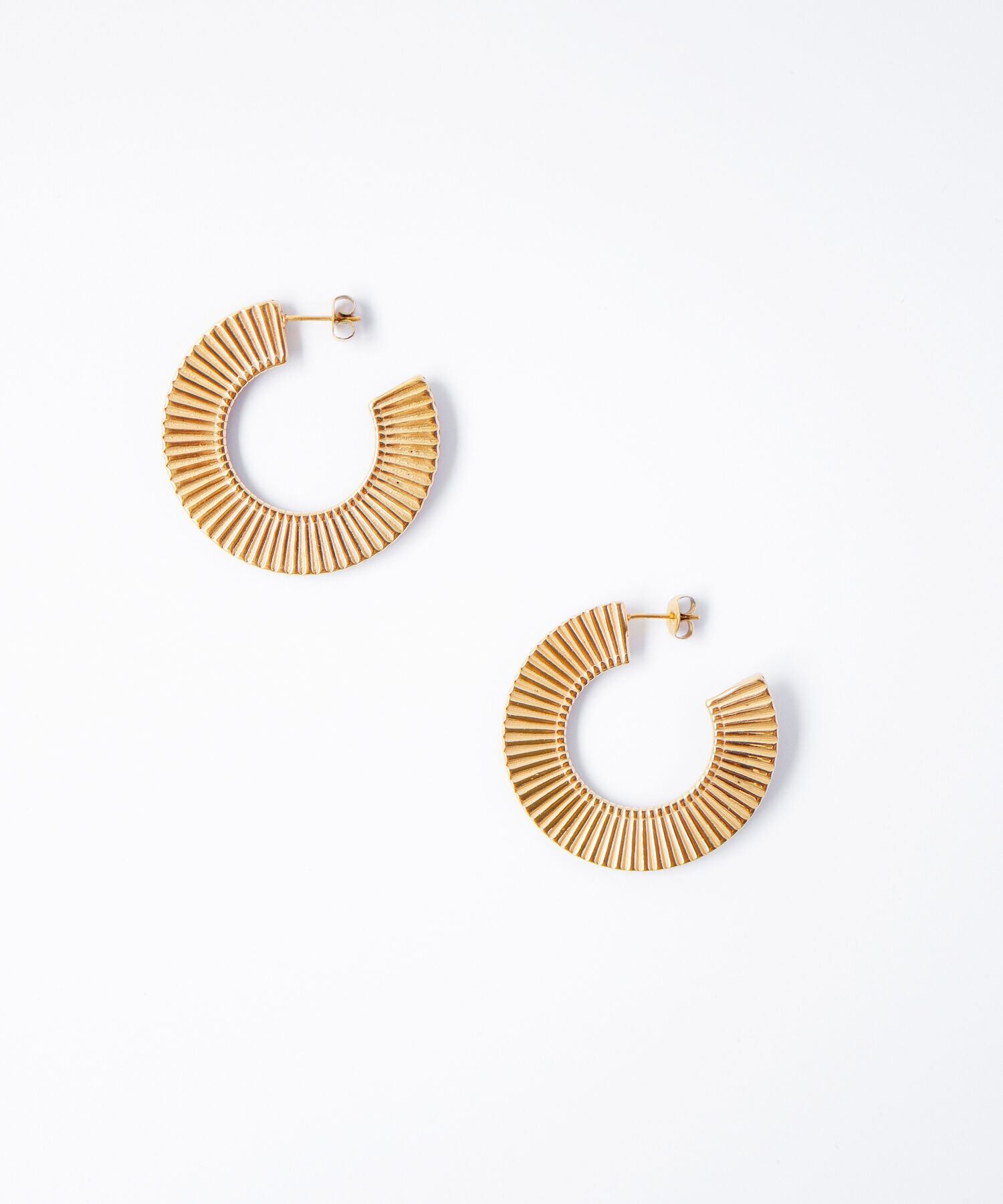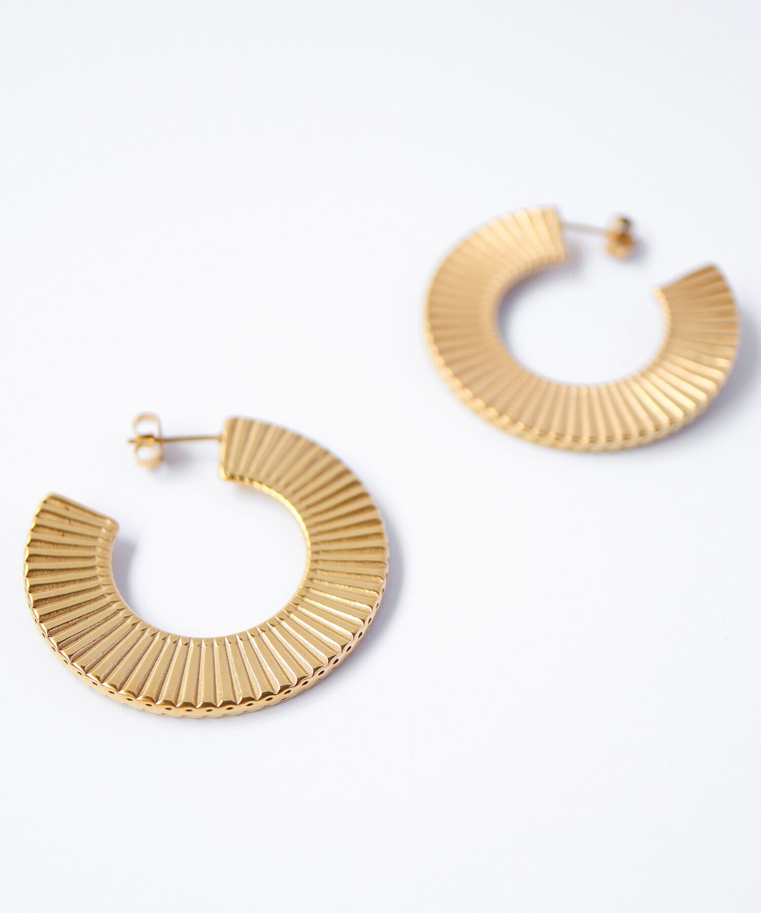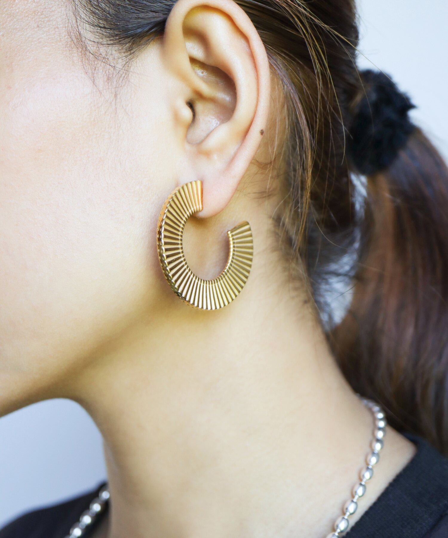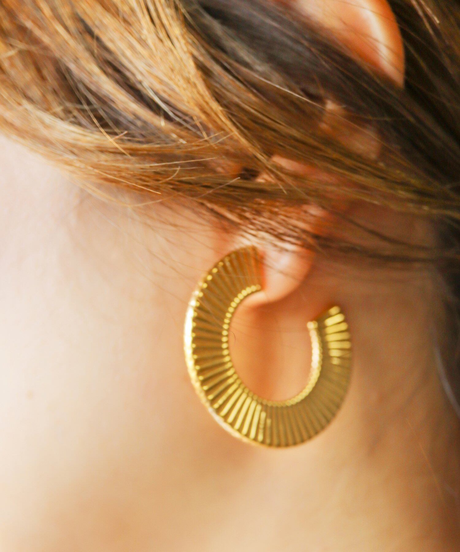 細かいカットが光を美しく反射する、人気のハーフフープピアス。