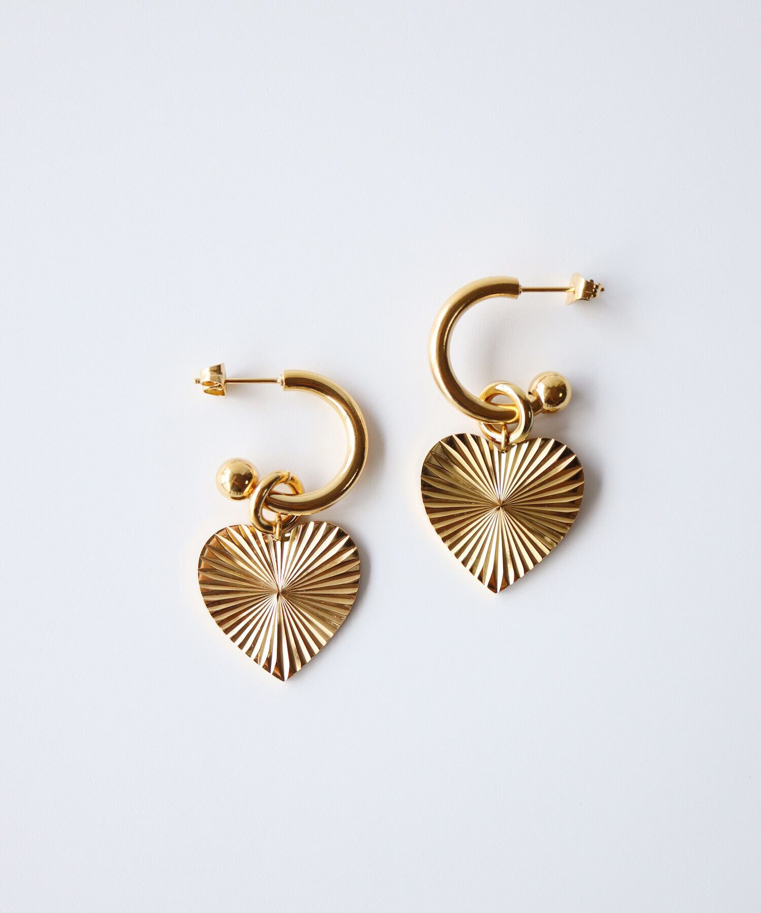 繊細なデザインが女性の心をくすぐる。放射線にカットが施されたハートチャームは、光をとらえキラキラ輝く魅力的なピアス。