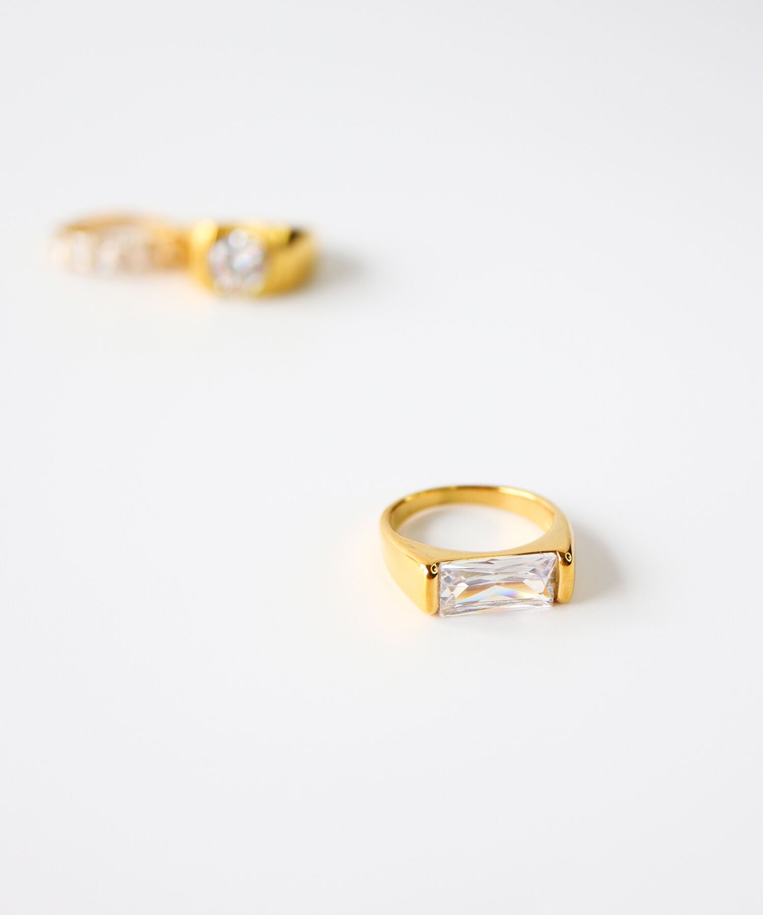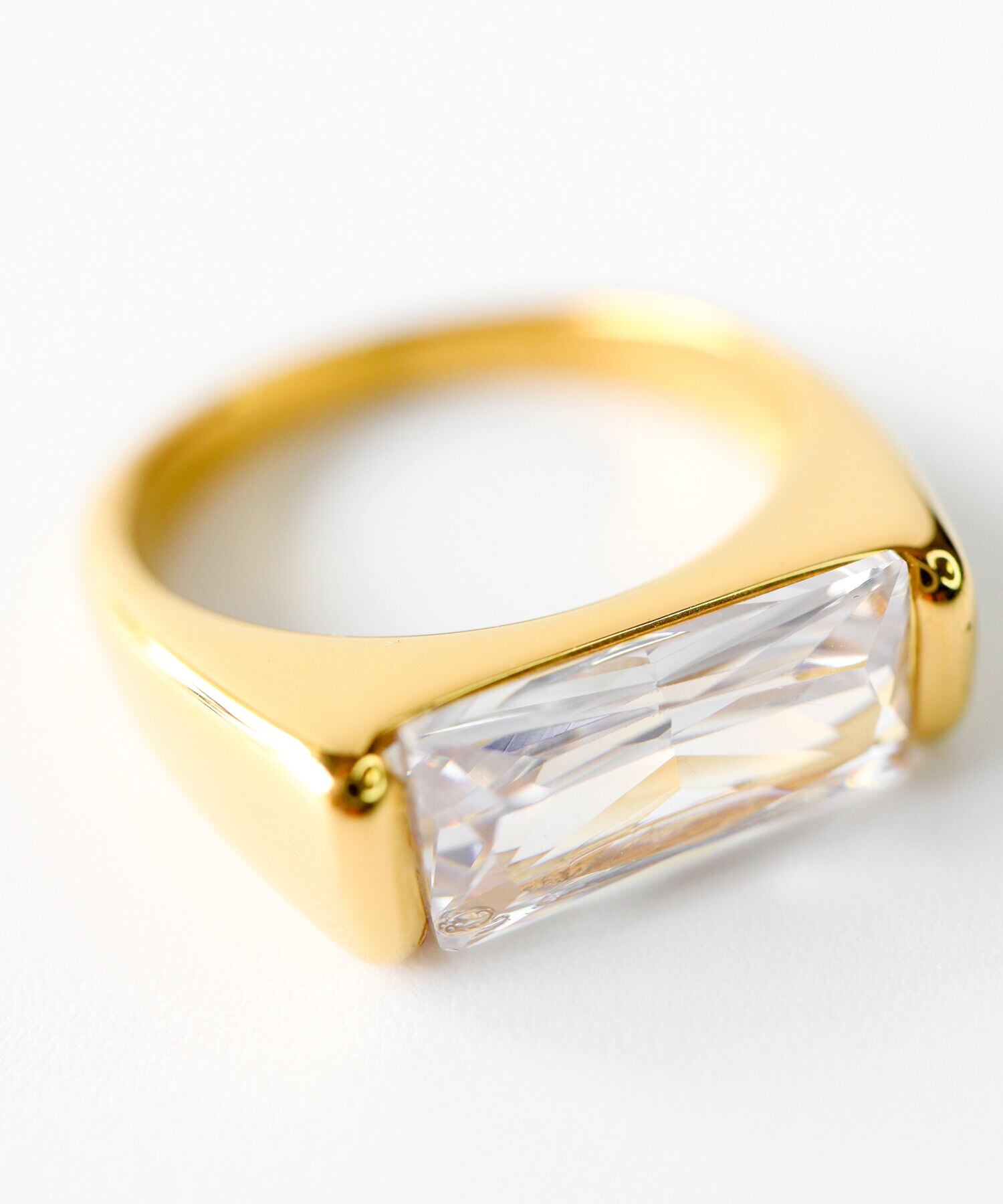 バゲットカットされたジルコニアが、シャープで洗練された美しさのリング。