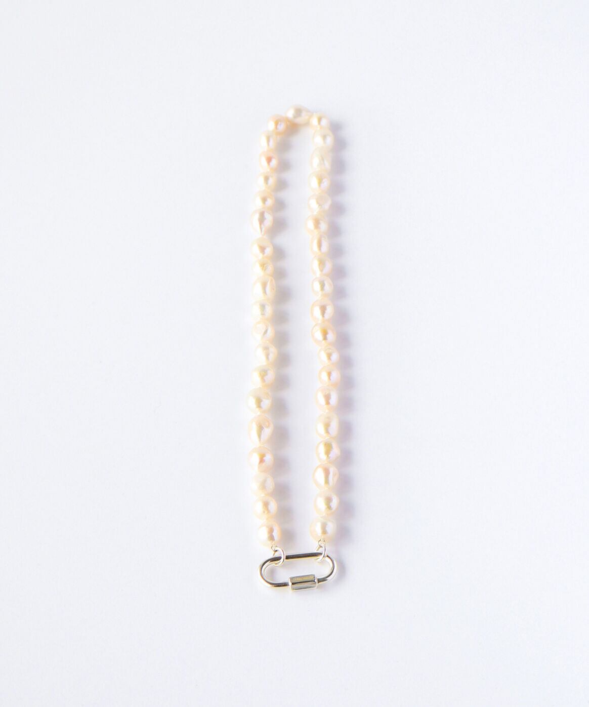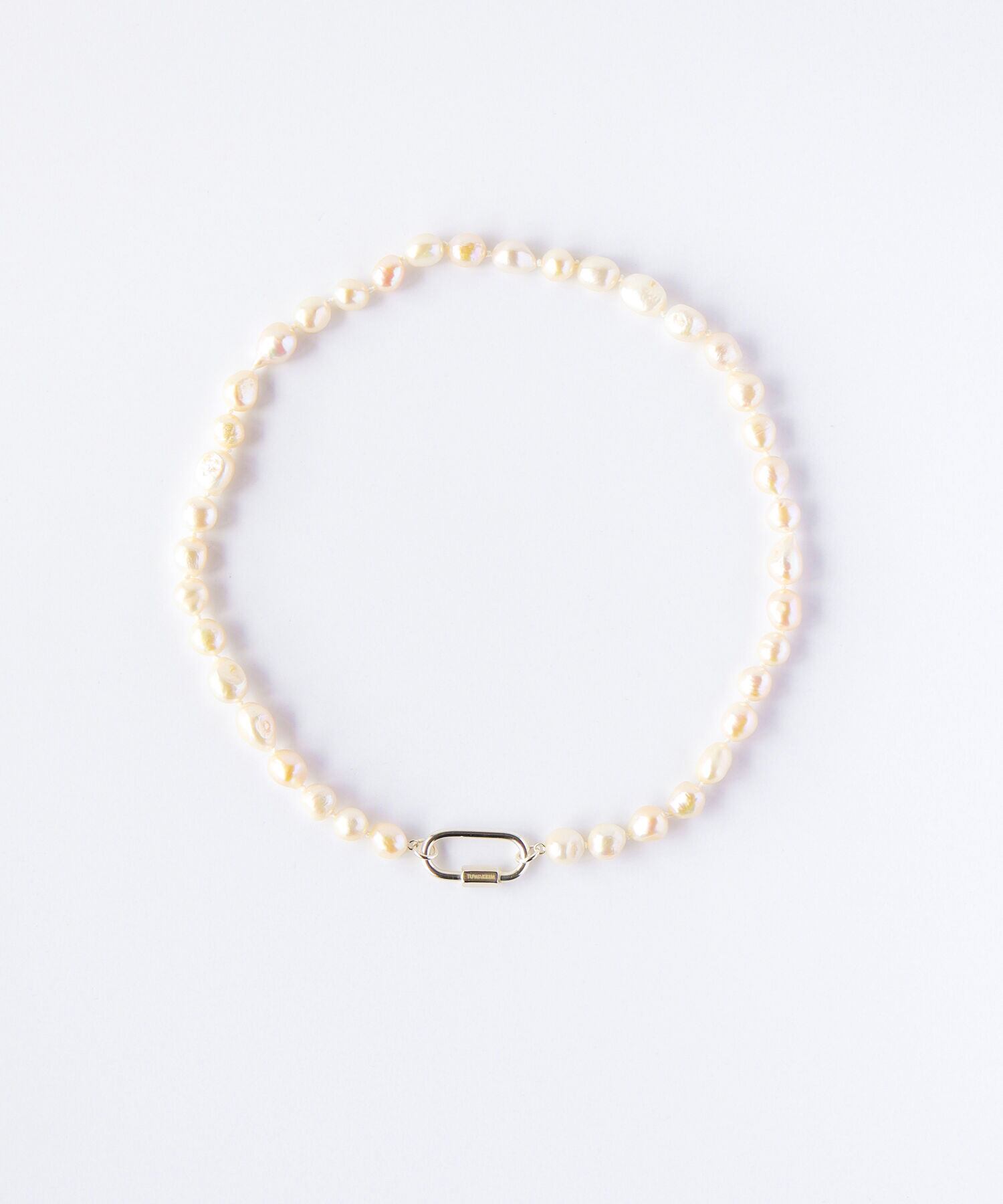 パールのエレガントさ×カラビナのカジュアルさを融合させた、唯一無二の存在感を放つネックレス。普段はエレガントなパールネックレスとして、時にはカラビナを前に持ってくることでクールな個性を表現。メンズにもおすすめなスタイリッシュなアクセサリー 。
