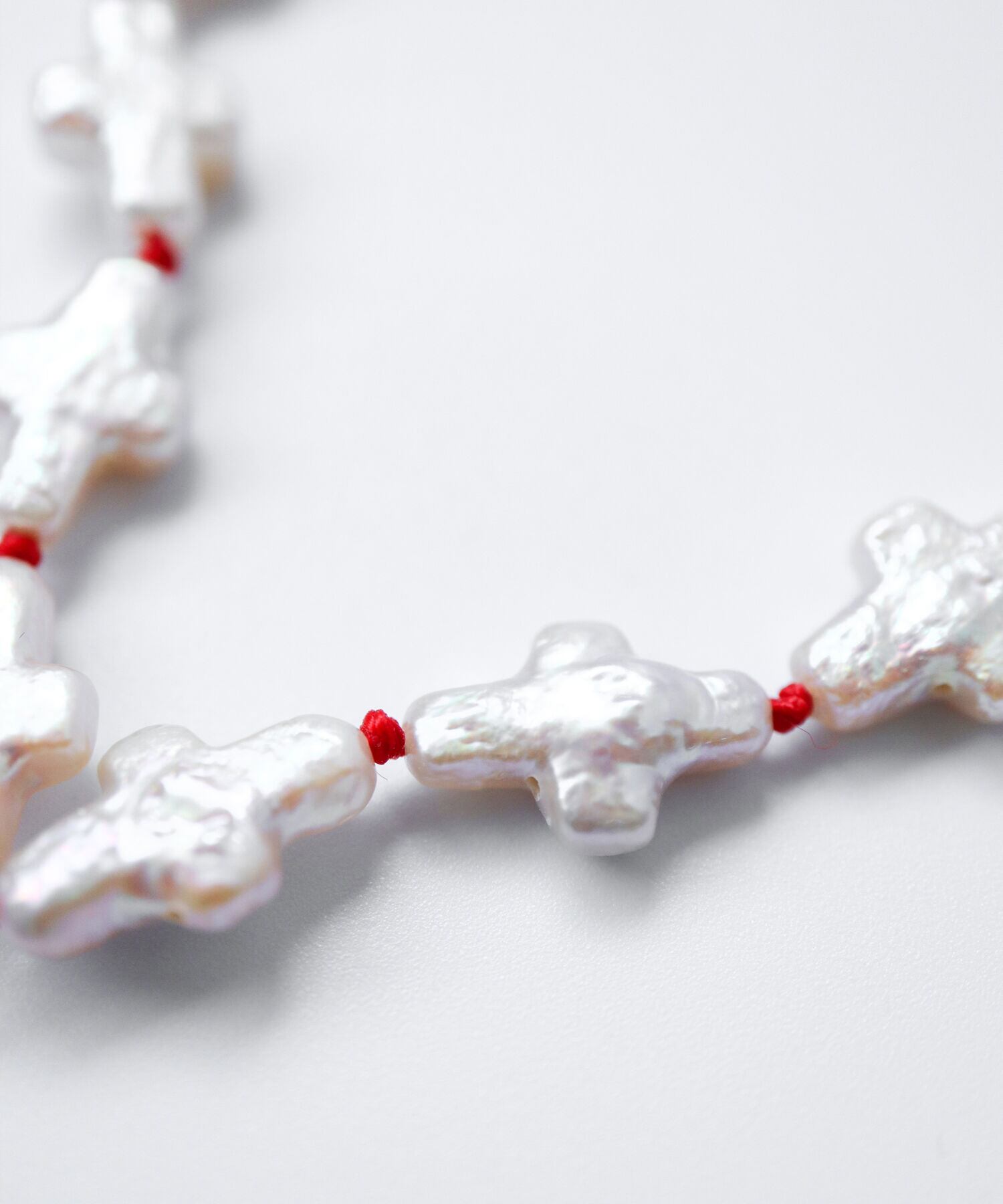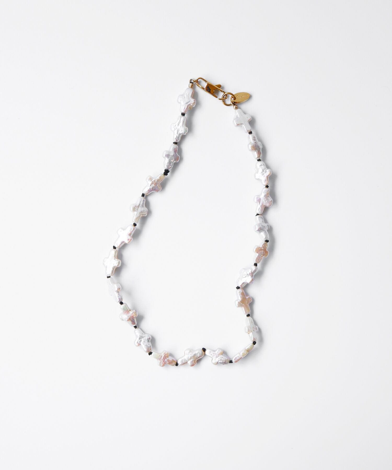 貴重なクロスパールシェイプのパールを、オールノットで丁寧に編んだネックレス。