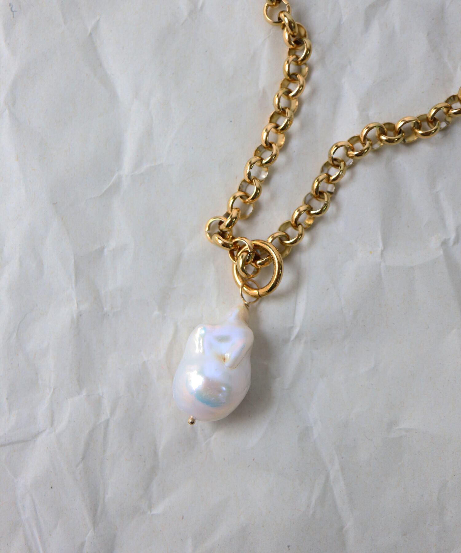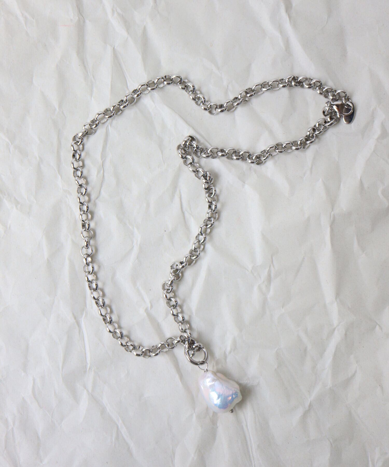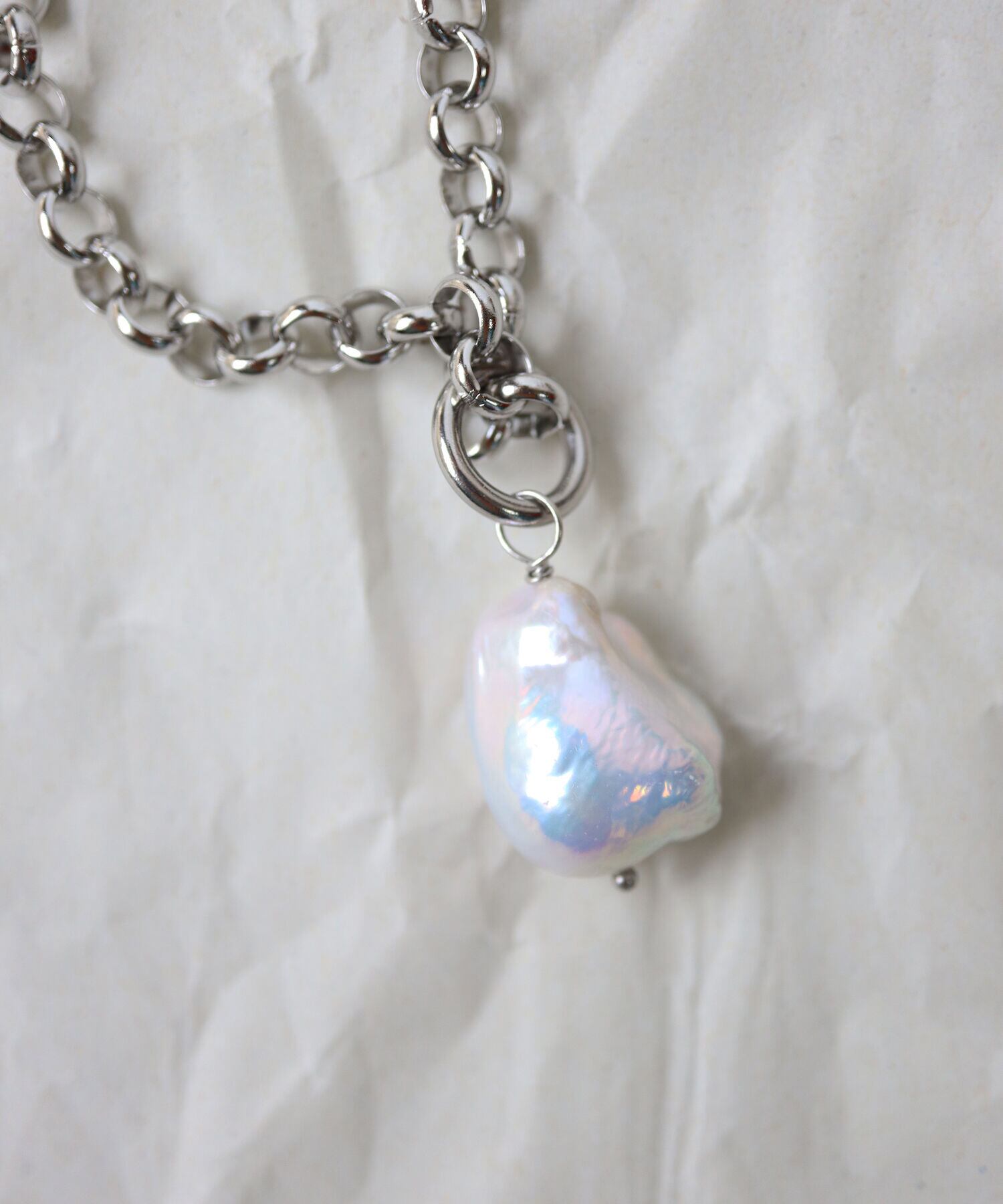 オイスタータイプのバロックパールにあえて太めのチェーンをセット、インパクトのある仕上がりに。