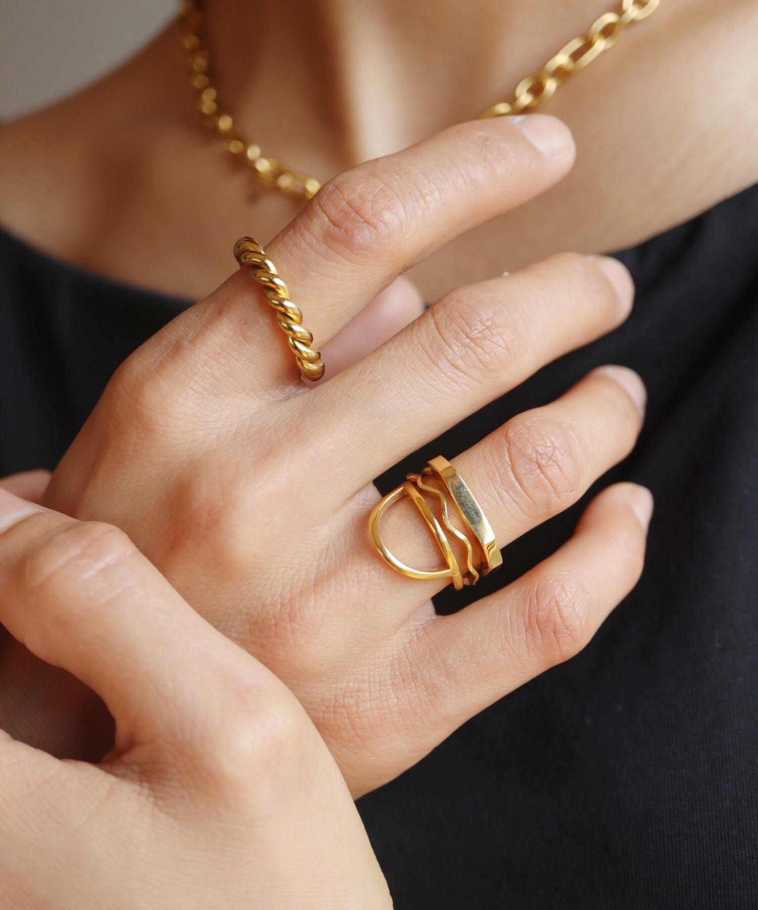 シンプルな地金のみのデザインなので手持ちのリングに併せてみては。