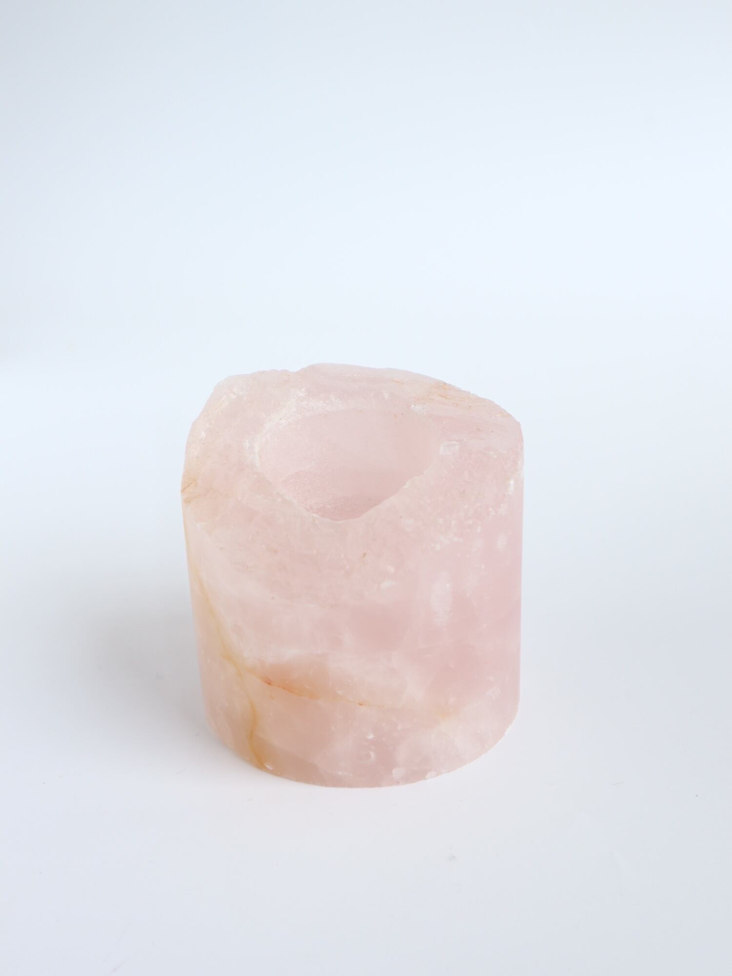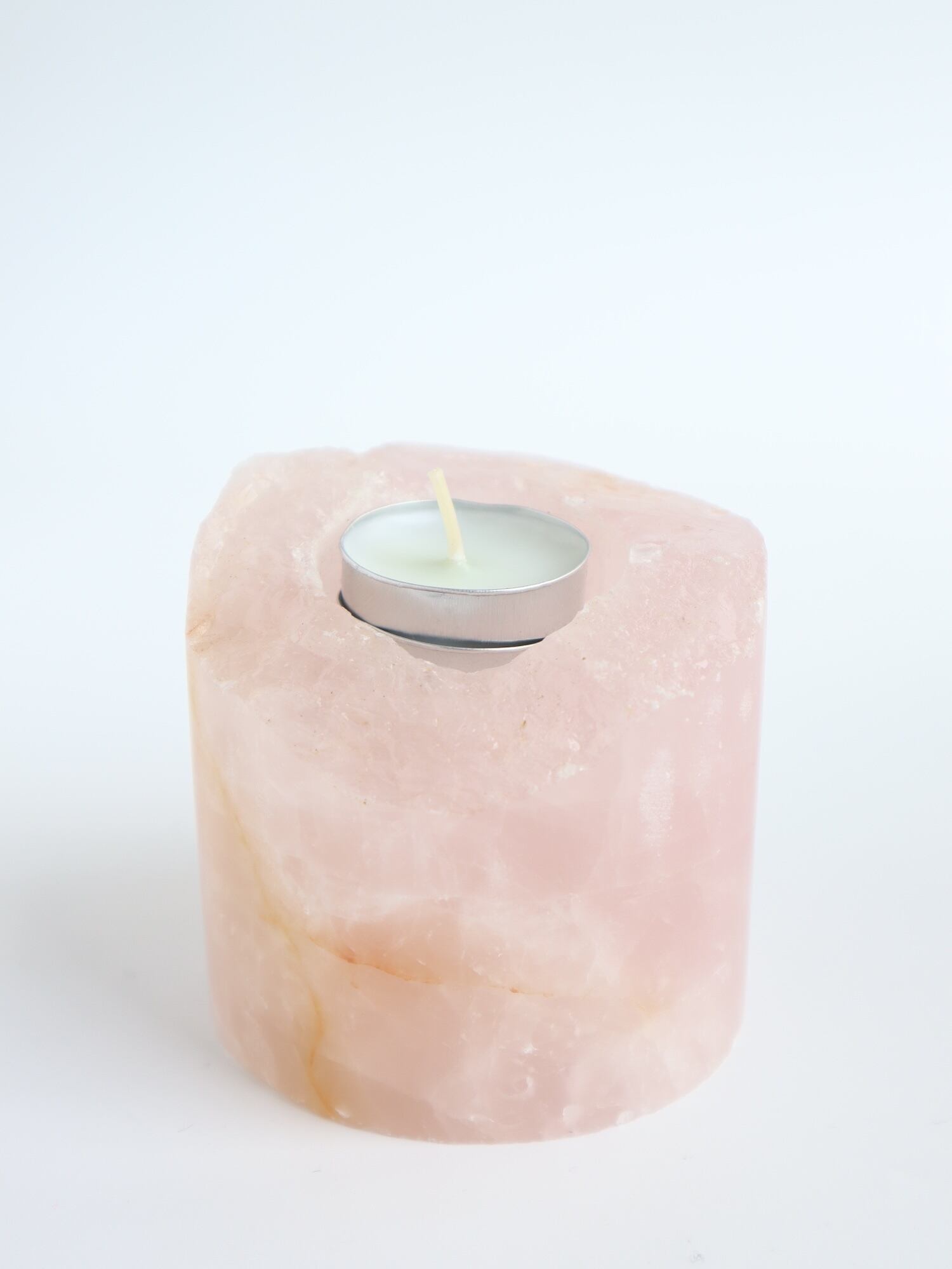 キャンドルの灯りを受けると、淡いピンクがじんわりと透け、やわらかな光が石全体に広がります。