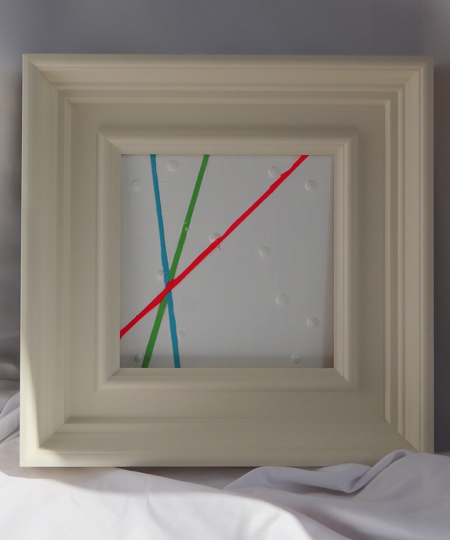 鮮やかなラインとキャンバスの丸い膨らみ(ぽつぽつ)が印象的な作品。