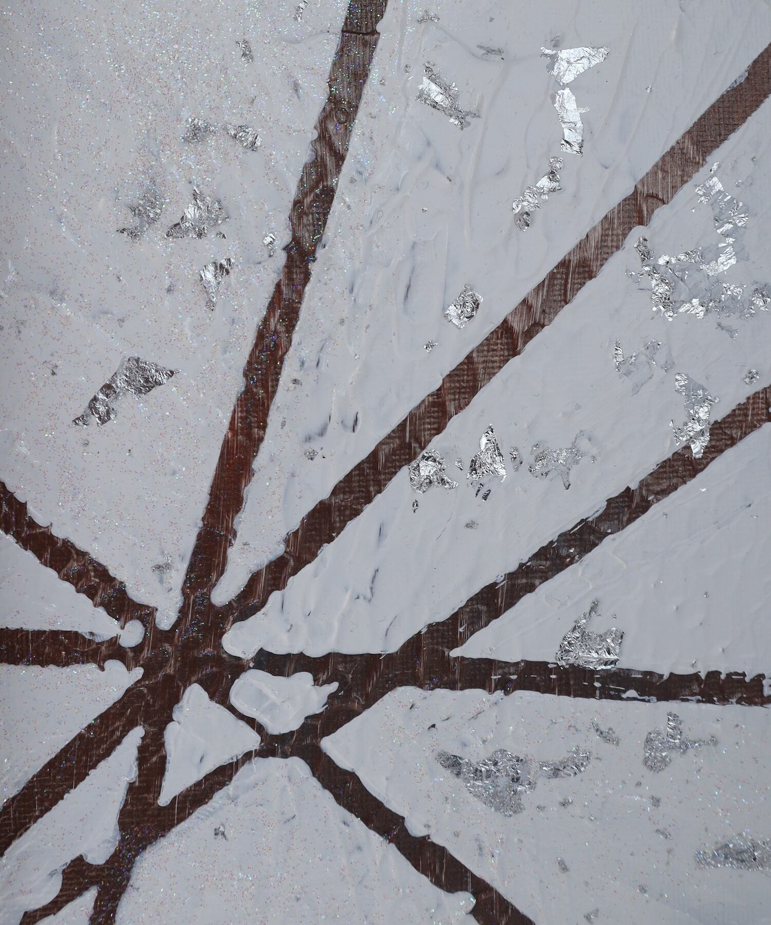 迷いながらも輝き続ける。完全ではない放射状に伸びる線。箔やラメが光の入り方で表情を変える作品。