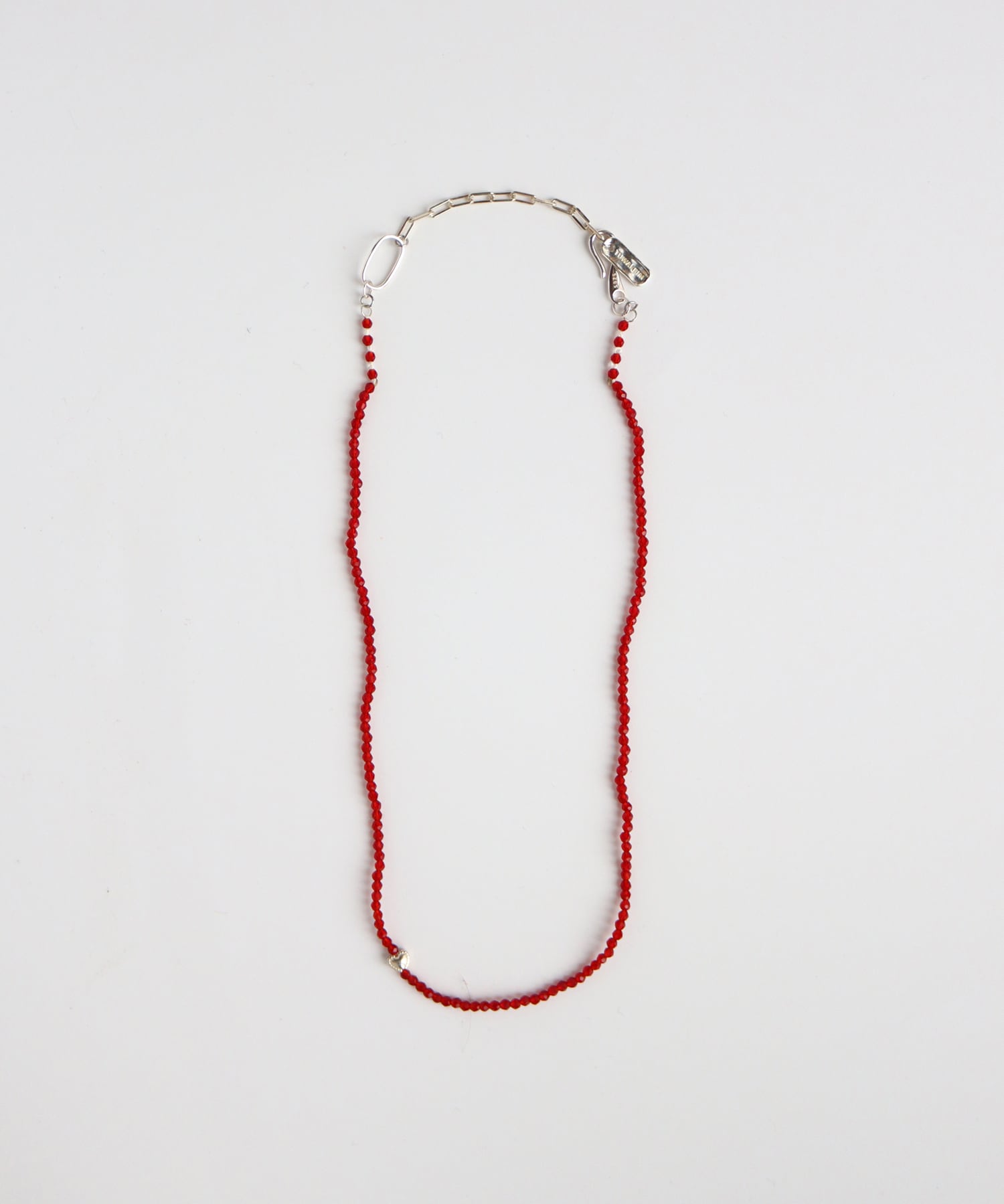 深紅のガーネットが放つ鮮やかな輝きに、小さなシルバーハートがキュートなアクセントを添えたネックレス。華奢なデザインだからこそ、ガーネットのキラキラとした光が引き立つ一品。