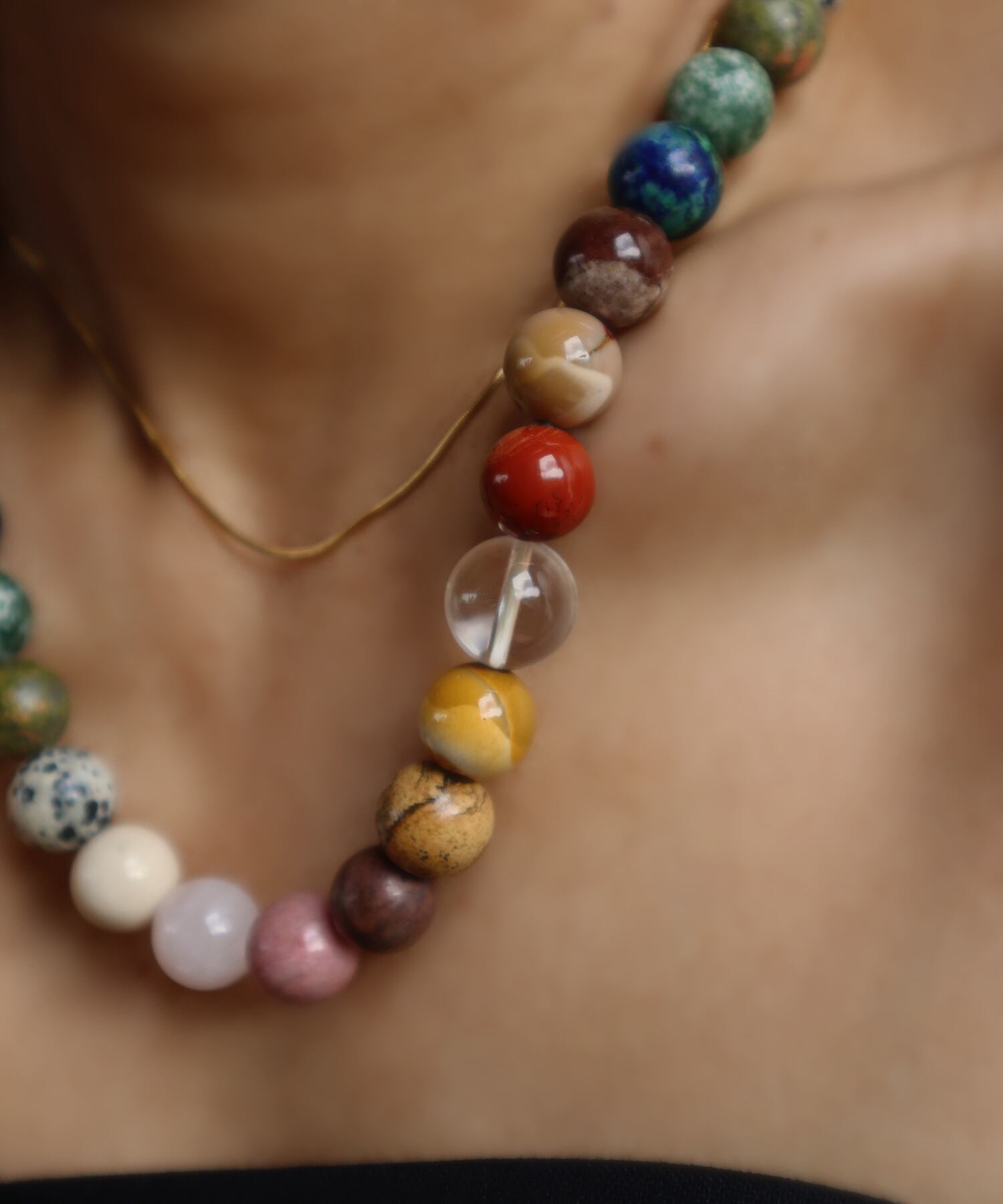 ひと粒ひと粒がそれぞれの星のように輝き、胸元に広がる銀河を描く。