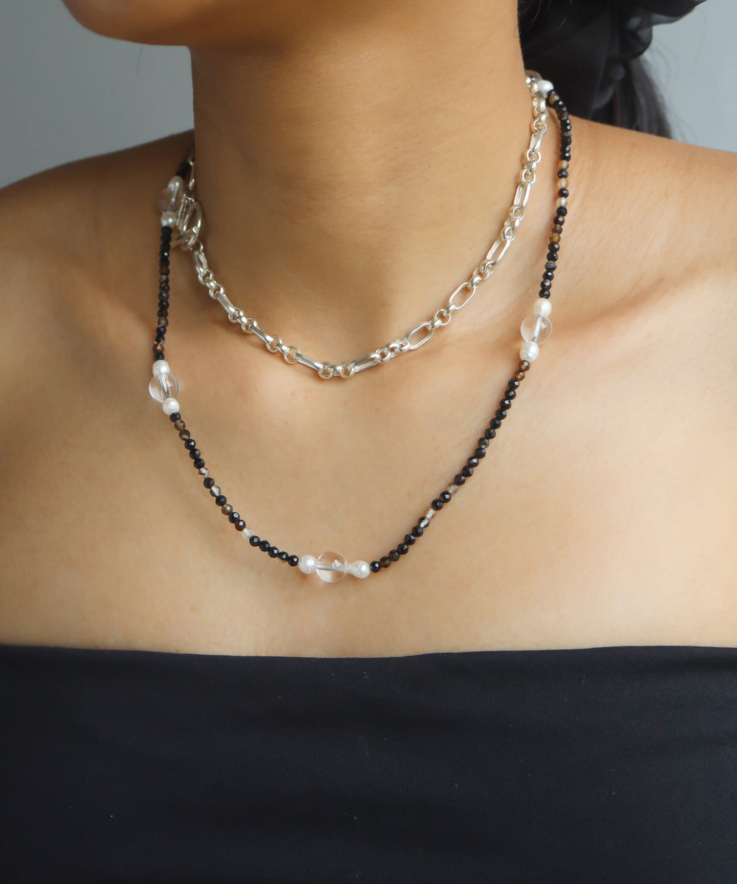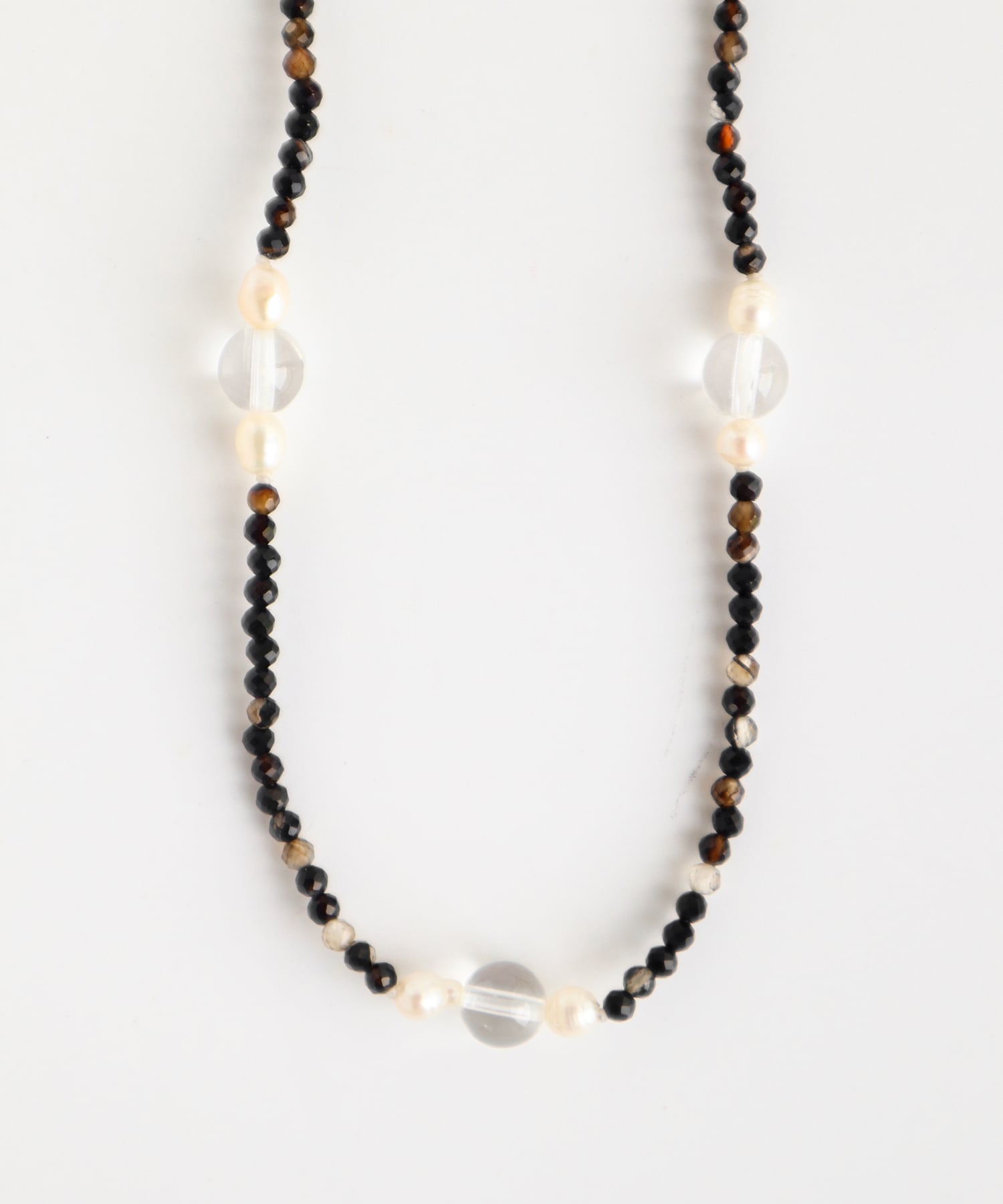 黒瑪瑙(アゲート)に、クリスタルとパールを添えたミックスネックレス。