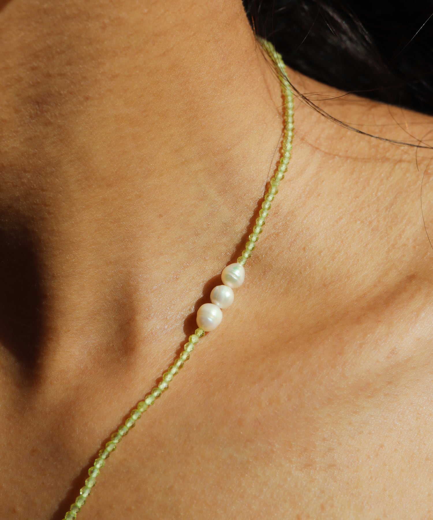 ペリドットの小粒ビーズに、艶やかなパール。
